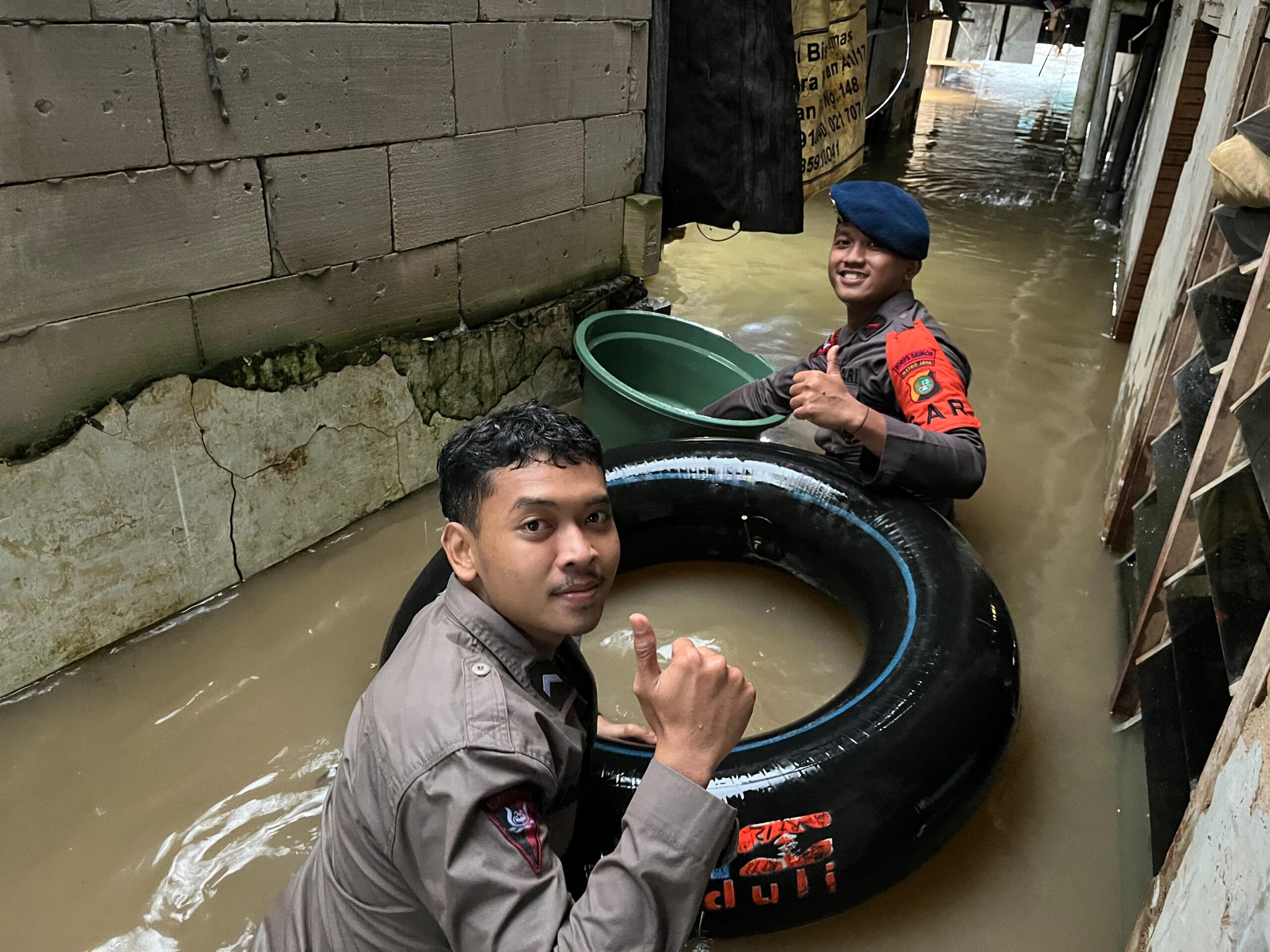 Satuan Brimob Polda Metro Jaya tetap bersiaga dan mengimbau masyarakat agar waspada terhadap potensi banjir susulan serta mengikuti arahan petugas di lapangan.