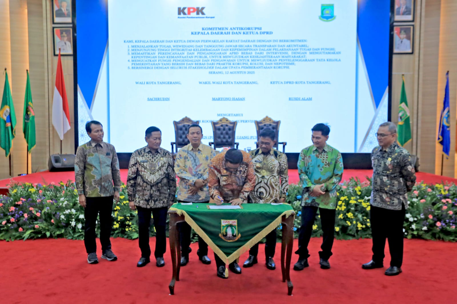 Tangerang – Dalam upaya memperkuat tata kelola pemerintahan yang bersih dan transparan, Wali Kota Tangerang H. Sachrudin dan Wakil Wali Kota H. Maryono Hasan, resmi menandatangani komitmen antikorupsi bersama Komisi Pemberantasan Korupsi (KPK). Penandatanganan dilakukan pada Selasa (12/08/2025) di Aula Pendopo Gubernur Banten, Serang, yang dihadiri oleh Direktur Koordinasi dan Supervisi Wilayah II KPK RI, Bahtiar Ujang Purnama.