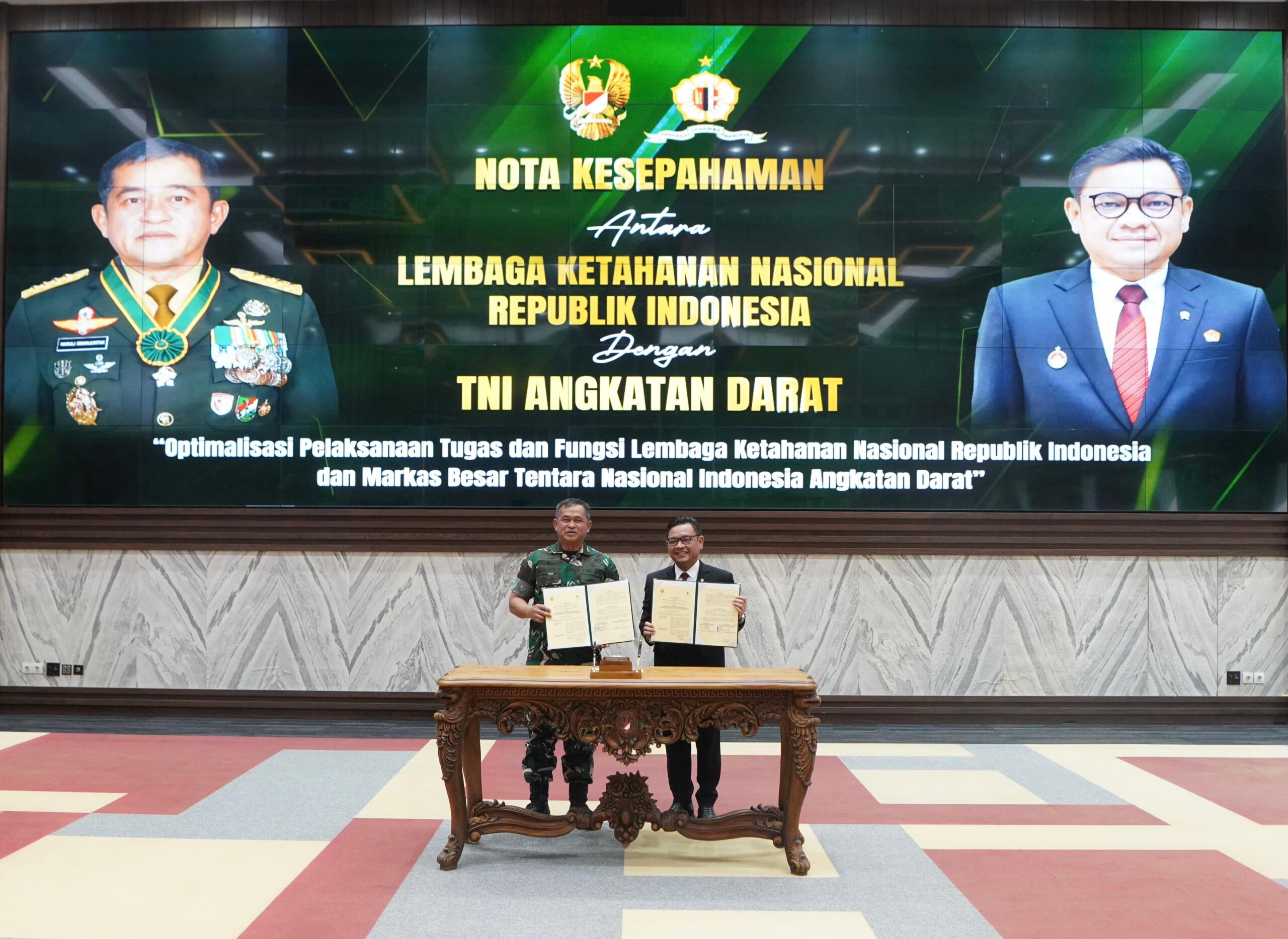 Penandatanganan dilakukan langsung oleh Kepala Staf Angkatan Darat (Kasad) Jenderal TNI Maruli Simanjuntak, M.Sc., bersama Gubernur Lemhannas Dr. H. TB. Ace Hasan Syadzily, M.Si., sebagai bentuk sinergi dalam optimalisasi pelaksanaan tugas dan fungsi masing-masing institusi dalam mendukung ketahanan nasional.