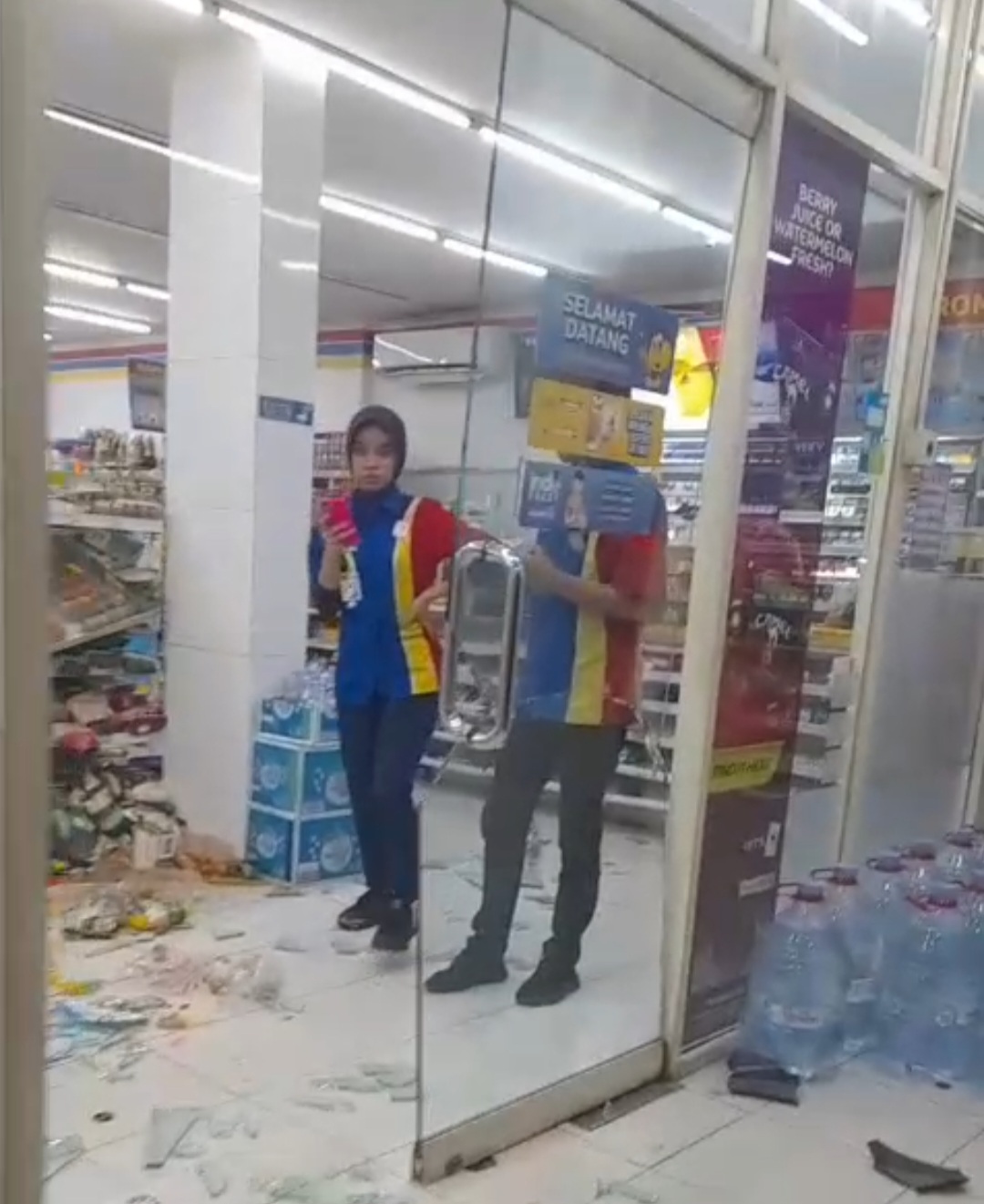 “Motor itu seperti kehilangan kendali.Tiba-tiba langsung menabrak pintu kaca Indomaret,” ujar salah satu warga yang berada di lokasi.