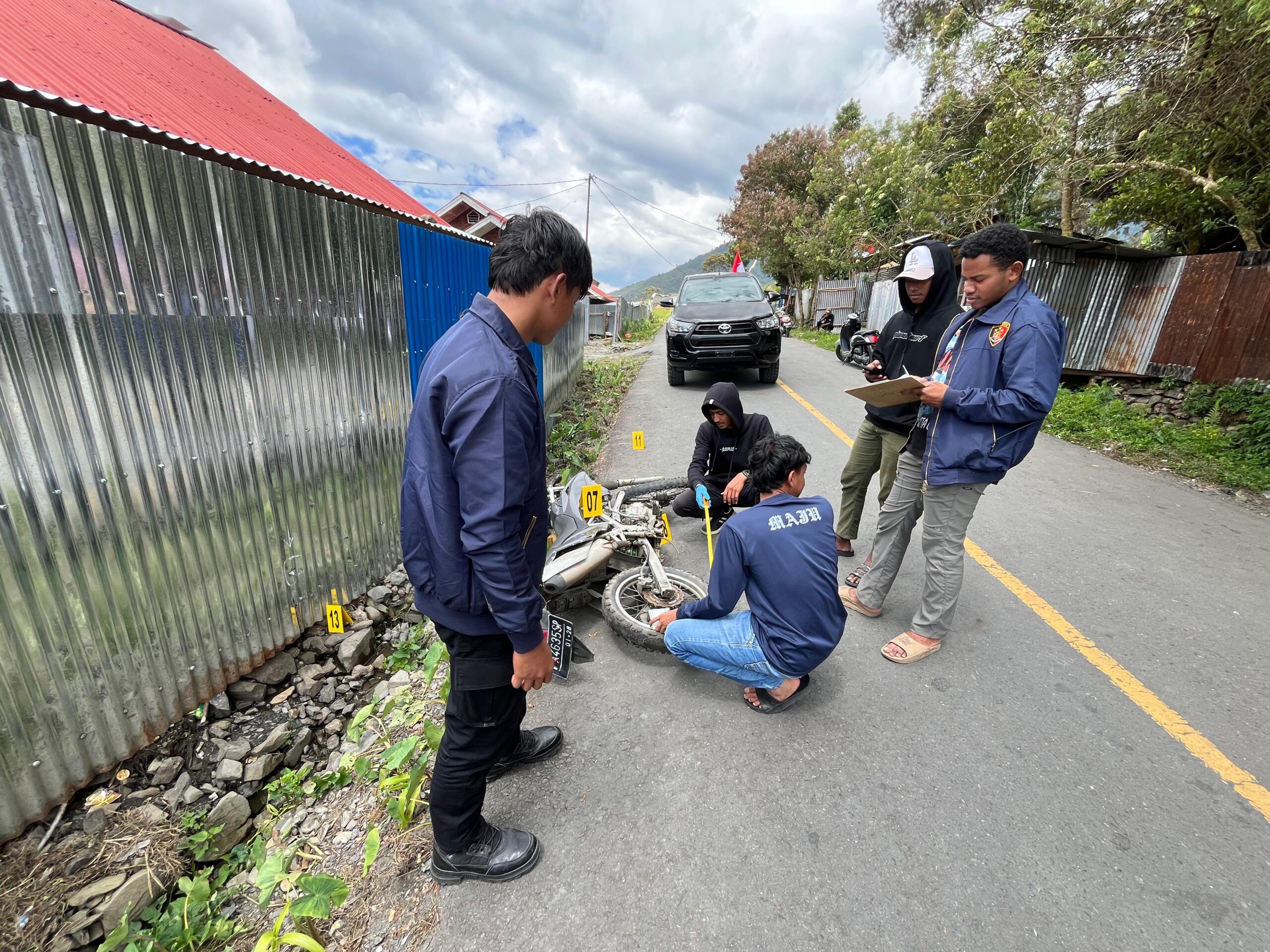 Hasil olah TKP menetapkan sejumlah titik penting, di antaranya, posisi korban saat tergeletak, sepeda motor, helm, serta jerigen berisi minyak tanah milik korban, posisi pelaku Kindiku Tabuni alias Gumbanak saat menembak korban, dan posisi kendaraan yang digunakan oleh pelaku lainnya yakni Konara Enumbi yang telah berhasil ditangkap oleh personel Satgas Ops Damai Cartenz pada Jum’at (15/8/2025) pukul 10.40 WIT di sebuah honai Kampung Usir Depan, Kabupaten Puncak Jaya.