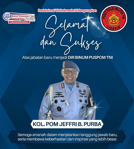 Jakarta | Wolindonesia.id – Seluruh Redaksi Media Wolindonesia.id menyampaikan ucapan selamat dan apresiasi atas jabatan baru yang diemban Kolonel Pom Jeffri B Purba, yang resmi menjabat sebagai Direktur Pembinaan Umum Pusat Polisi Militer Tentara Nasional Indonesia (Dirbinum Puspom TNI).